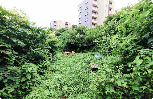 椿峰ニュータウンの中の集合住宅地の中にひっそりとある秘密基地のような場所です。一瞬踏み入れていいのか迷う緑の木々をくぐるとベンチと椅子が!?冒険気分をぜひ味わってみてください。